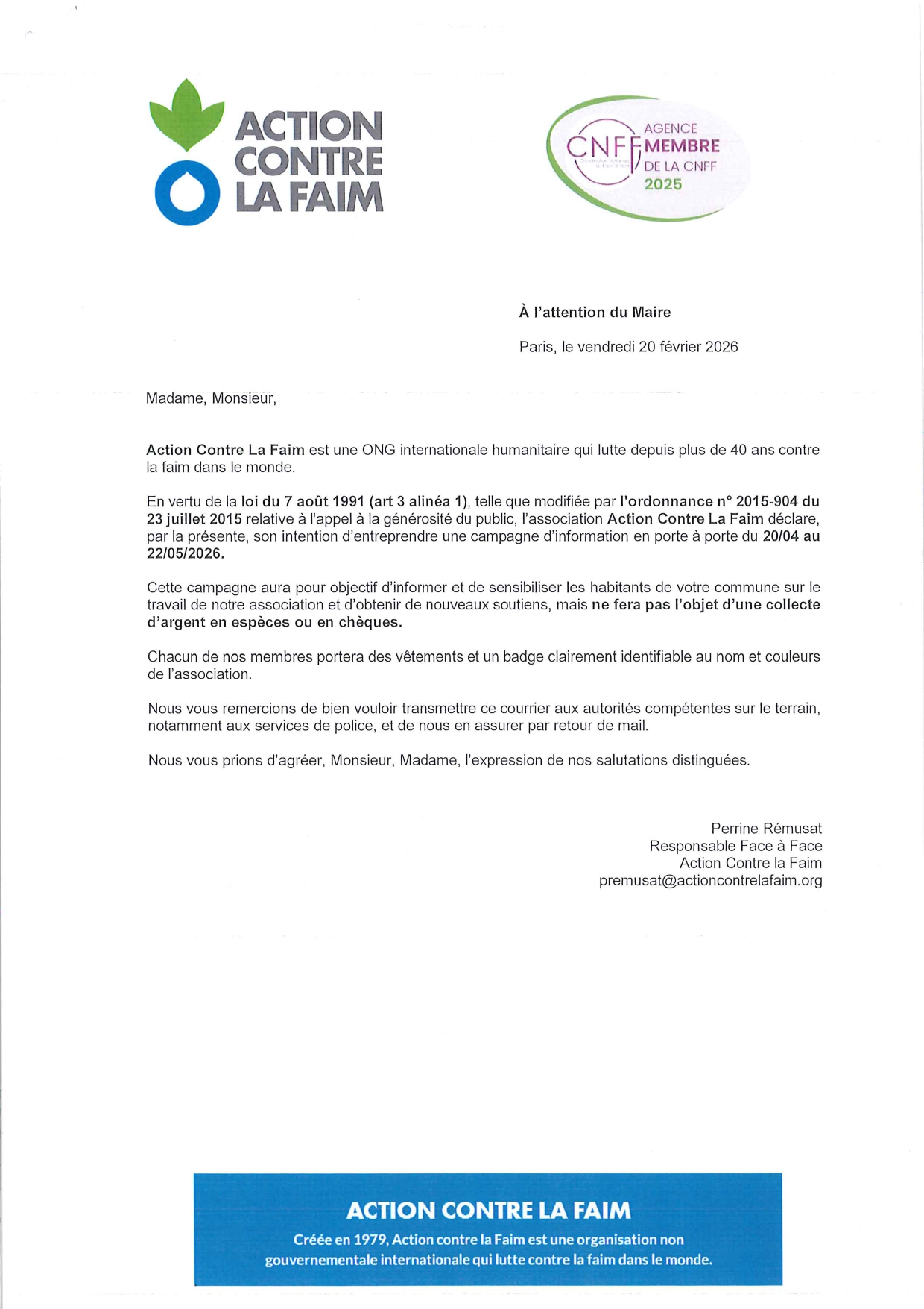 ACTION CONTRE LA FAIM : Campagne de sensibilisation porte à porte