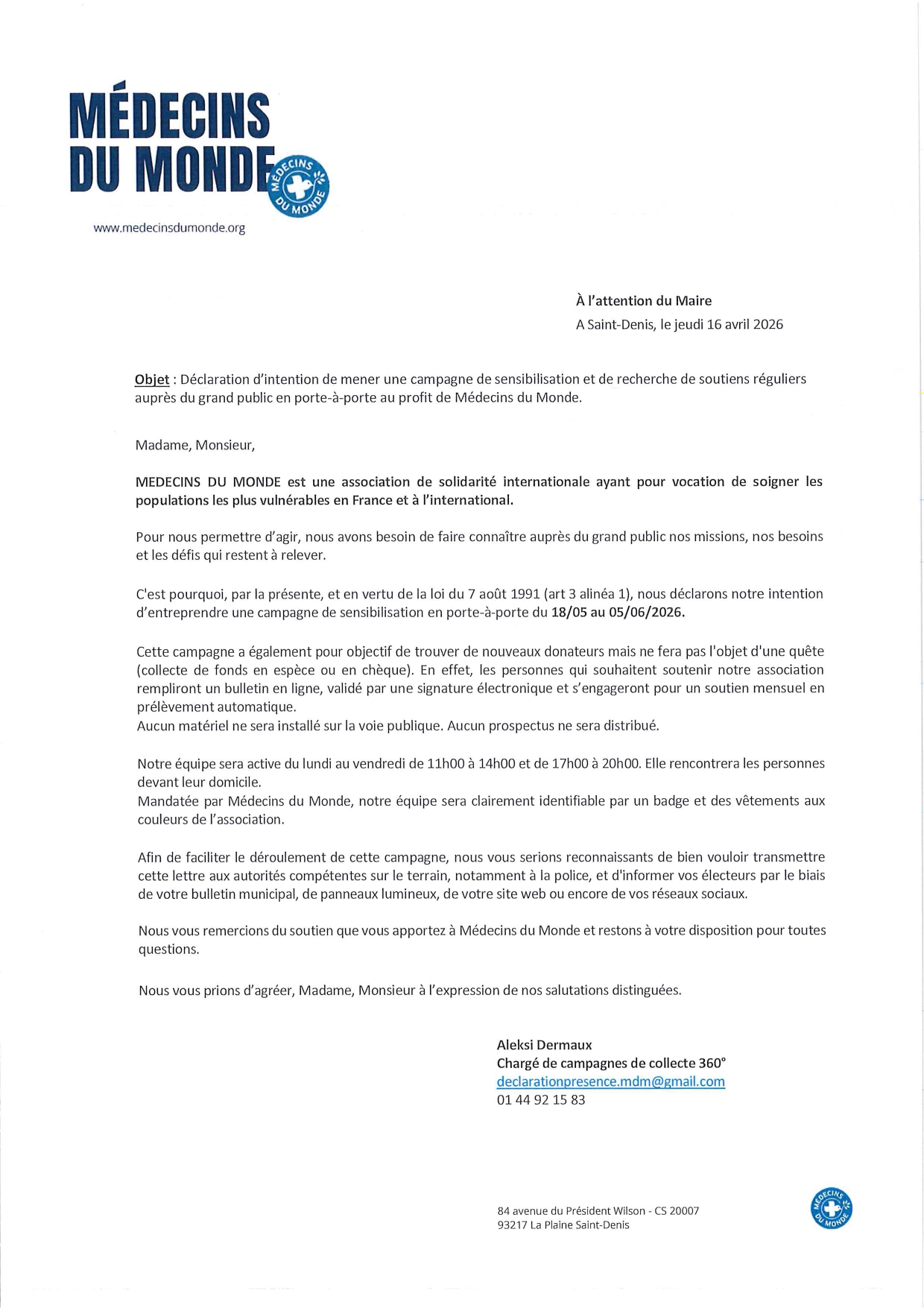 Info porte à porte : Médecins du Monde campagne de sensibilisation du 18.05 au 05.06.2026